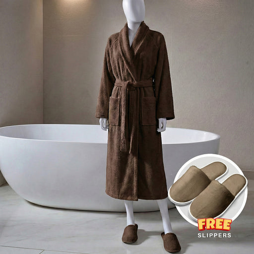 Premium Cotton Brown Terry Bathrobe with Pockets, One Size Fits All with Free Bath Slippers
